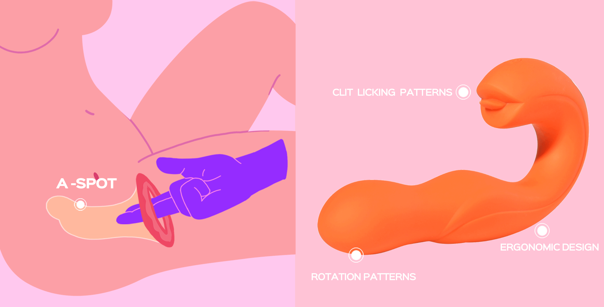 The A-spot is located even deeper inside the vagina, right above the cervix. It's less well-known than the G-spot, but for those who have found it, it's a game-changer. To stimulate the A-spot, you'll want to use a toy with a long, curved shape, like the Joi - Rotating Head G-spot Vibrator & Clit Licker.