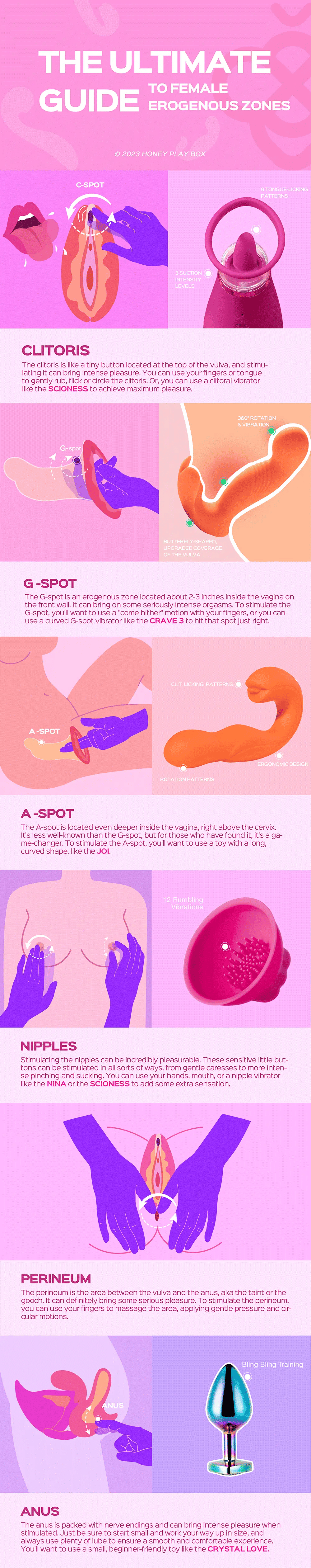 Welcome to our guide on the incredible world of female erogenous zones! Primary female erogenous zones · 1. Clitoris · 2. G-spot · 3. A-spot · 4. Breasts & Nipples · 5. Perineum.These spots are seriously tantalizing and can send shivers down your spine in the best possible way. Let's dive in and explore some of the most amazing erogenous zones out there.