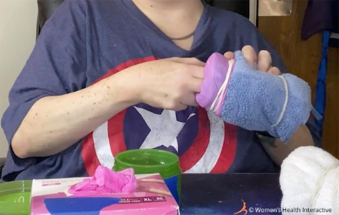 Roll the glove loosely inside a folded towel (like a burrito), slide it into a cup, fold the glove opening over the rim, secure it with a rubber band, and add lube.