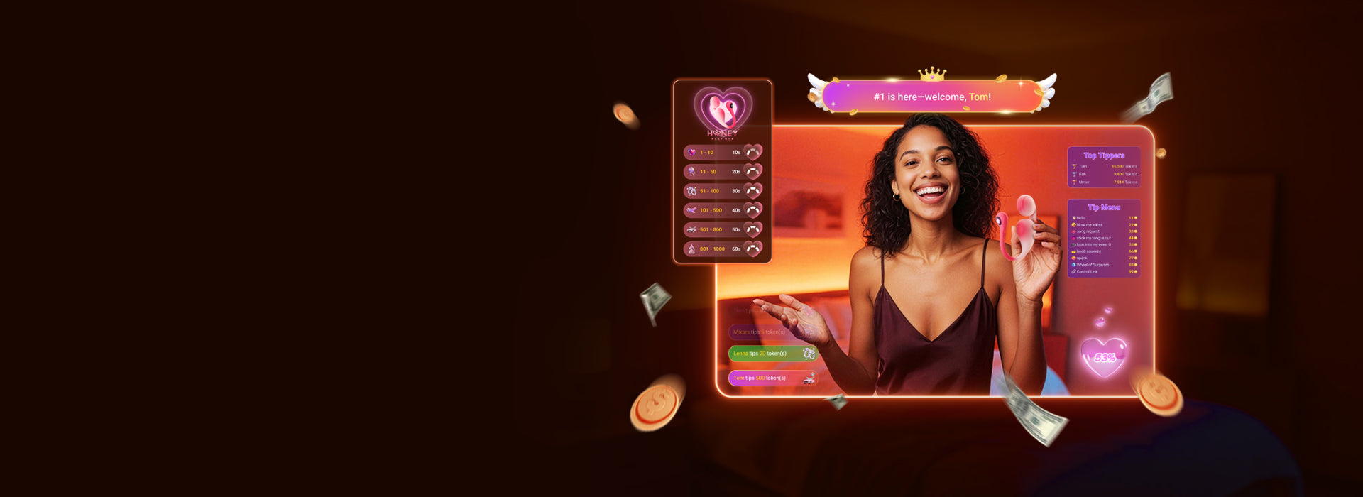 Viewers send token-based gifts (1 to 500+ tokens), which unlock escalating visual animations and stronger toy vibrations. The higher the tier, the more immersive the experience for both the model and the audience.