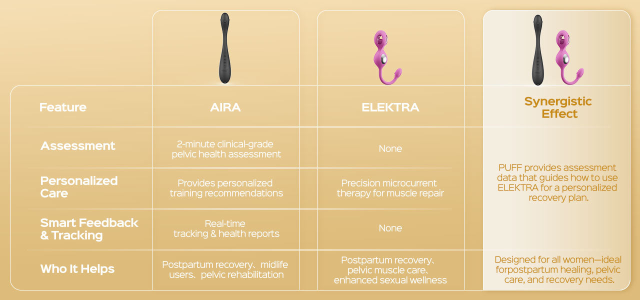 Whether caused by prolonged sitting, incomplete postpartum recovery, or similar conditions, AIRA and ELEKTRA deliver clinical-grade solutions for pelvic floor issues.